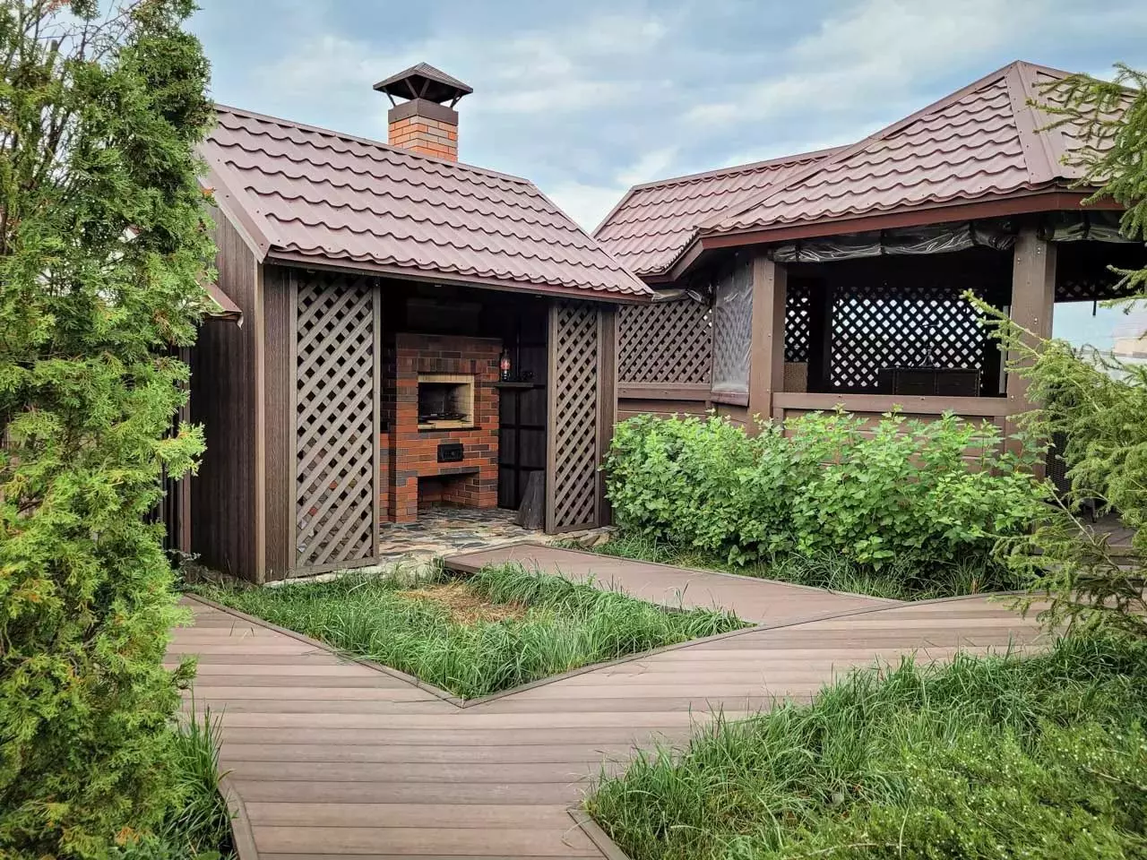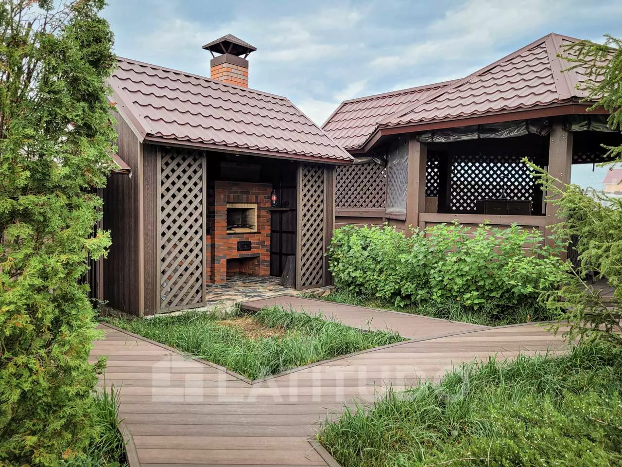 Беседка с мангальной зоной из ДПК с мягкой кровлей цвета